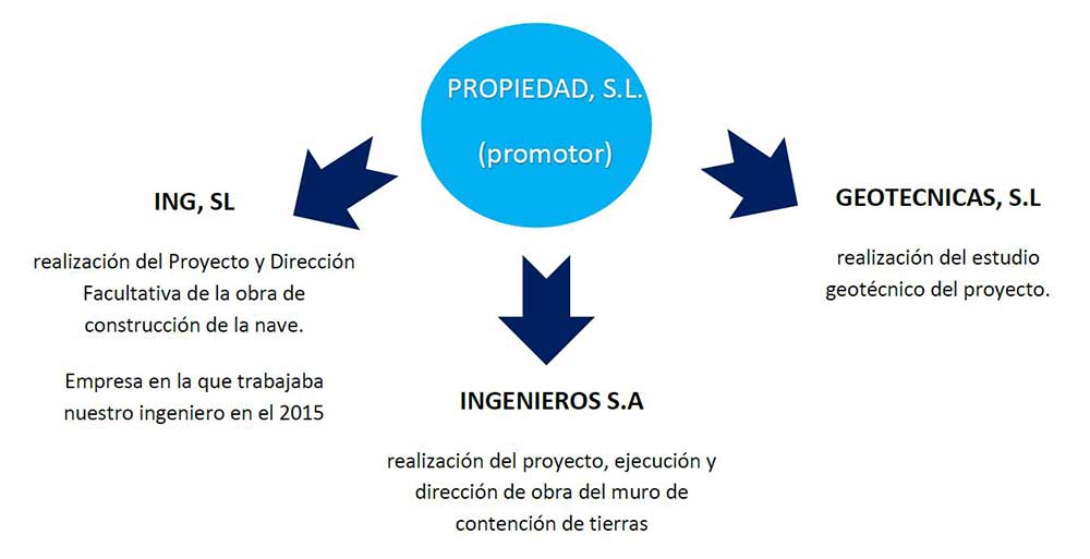 PROPIEDAD S.L., contrata a la empresa ING, SL, en la que trabajaba nuestro ingeniero en el año 2015, para la realización del Proyecto y Dirección Facultativa de la obra de construcción de la nave, siendo los técnicos asesores de la promotora. Asimismo, PROPIEDAD, S.L., contrata a INGENIEROS S.A. para la realización del proyecto, ejecución y dirección de obra del muro de contención de tierras de la urbanización de la nave industrial. Por último, se contrata a GEOTECNICAS, S.L. para la realización del estudio geotécnico del proyecto.