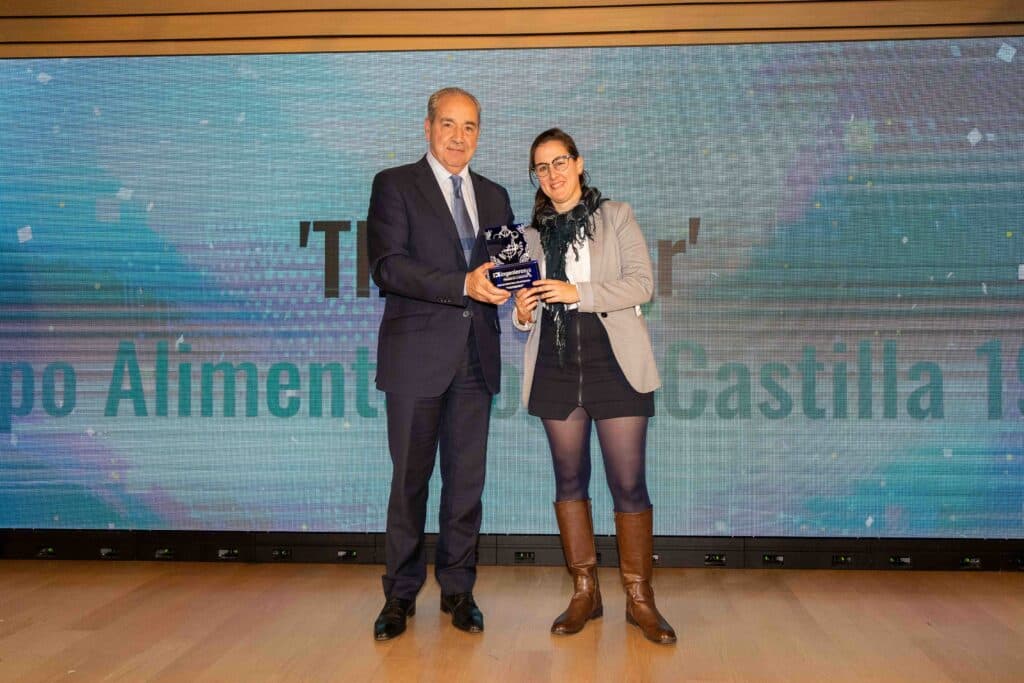 A continuación, se desvelaron los primeros ganadores de la noche: el premio a la categoría de ‘Startup Industrial Más Destacada’, que recayó ex aequo en Therminer y Grupo Alimentario Campos de Castilla 1986. Lucía Miguel Fraile, cofundadora y gerente de Grupo Alimentario Campos de Castilla 1986, y Aarón Molina Galán, CTO de Therminer, recogieron el premio de manos de Cipriano García, director general de Caja Rural de Zamora.