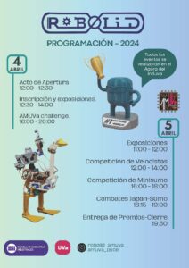 Para ello, se han organizado diferentes competiciones, además de charlas y exposiciones. La primera prueba será el jueves 4 de abril con el AMUVA Challenge, una competición de robots “futbolistas” en la que los equipos participantes deberán crear robots capaces de emular a los ases del balón en un máximo de cuatro horas. Posteriormente, se jugarán las eliminatorias, con premio para los tres mejores clasificados.