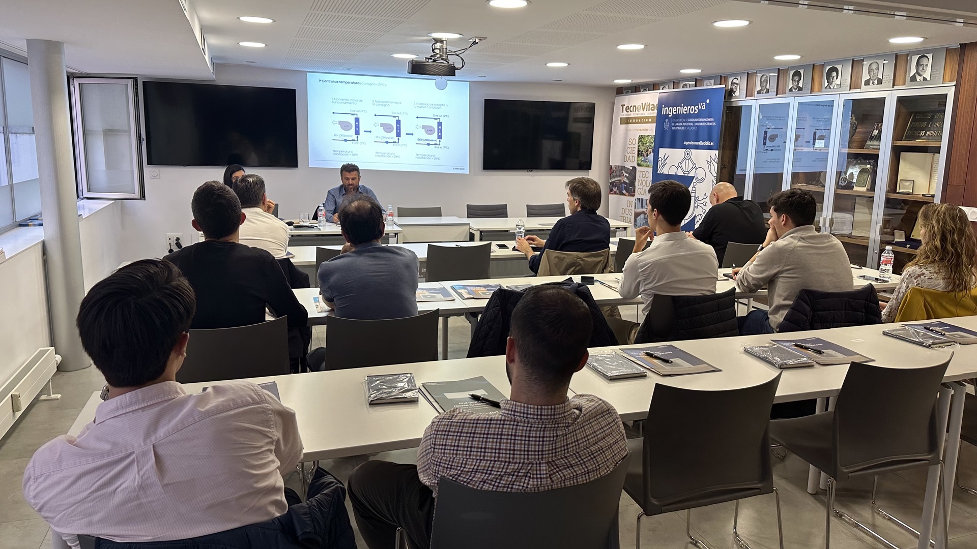 El pasado jueves 3 de octubre, la sede de ingenierosVA acogió una jornada técnica organizada por Samsung, en la que los colegiados pudieron conocer de primera mano los avances más recientes en sistemas de climatización de Flujo de Refrigerante Variable (VRF, por sus siglas en inglés). Estos sistemas, ampliamente utilizados en edificios comerciales y residenciales, se han consolidado como una de las soluciones más eficientes y sostenibles para el control del clima en grandes espacios.